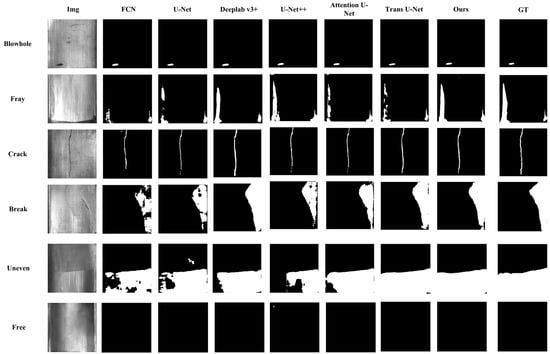 In this study, the proposed architecture is compared with state-of-the-art models used for semantic segmentation purposes. The predictions of the proposed segmentation structure are randomly selected from the test set and compared with advanced models such as FCN, U-Net, Deeplab v3+, U-Net++, AttentionU-Net, and Trans U-Net, as shown in Figure 7. From the figure, it is evident that the proposed model can most closely segment these defect areas compared to other segmentation methods. The most challenging areas to segment are Fray and its connection with Break. Therefore, most segmentation models perform poorly in segmenting Break and Fray, while our proposed segmentation network satisfactorily segments these regions.
