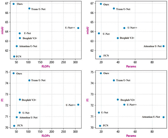 From Figure 8, it is visually clear that, although U-Net++, Trans U-Net, and Deeplab v3+ achieve good mIoU and F1 scores, the proposed segmentation network demonstrates advantages by achieving comparable mIoU and F1 scores at lower Flops and Params. Meanwhile, FCN, U-Net, and Attention U-Net have lower Flops and Params but poorer segmentation accuracy.