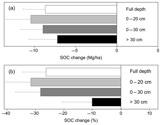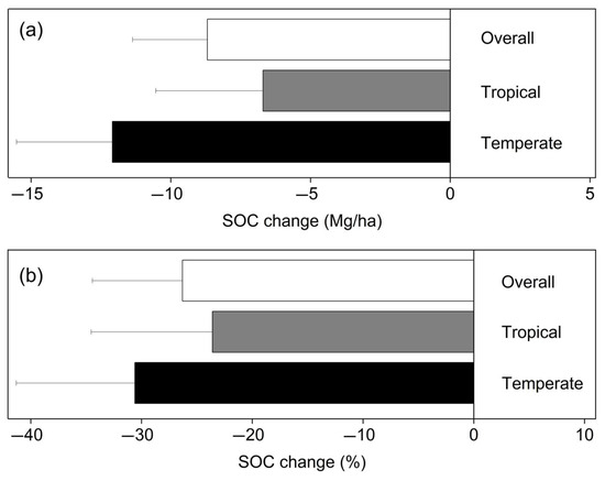 The results (Figure 3a,b) showed that the SOC storage decreased by 8.69 Mg/ha, corresponding to a decrease of 26.3% (p < 0.05). According to the climate zone, the SOC storage in the tropical region decreased by 6.70 Mg/ha, and the ratio decreased by 23.6% (p < 0.05). The SOC storage in temperate regions decreased by 12.09 Mg/ha, and the ratio decreased by 30.6% (p < 0.05).