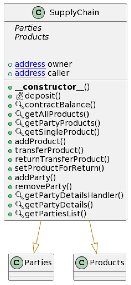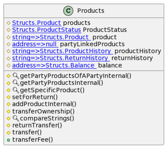 In Products.sol, operations that involve products directly are handled. This contract inherits Struct.sol for product structure definitions and emits a product if it is newly added to the chain, or the ownership of a product is changed; this contract utilizes the following functions, and the functional diagram of Products.sol and its interactions with other contracts can be seen in Figure 4, while the UML diagram for the contract can be seen in Figure 5.
