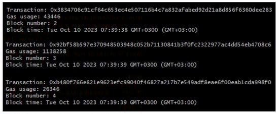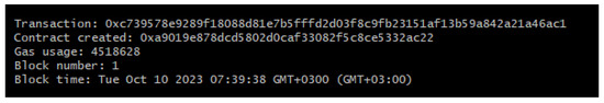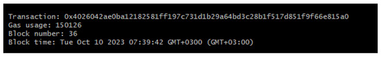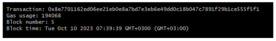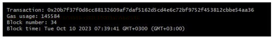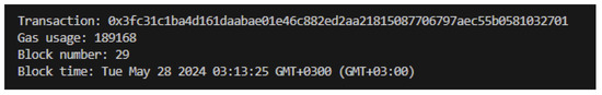 After the tests are concluded, the contract is deployed to the Sepolia Test Network of Ethereum. Deployment can be seen in Figure 22 and can be followed online at https://sepolia.etherscan.io/address/0x02cC5F4a884e96837F093784C0479B8F8249f01D (accessed on 12 April 2024).