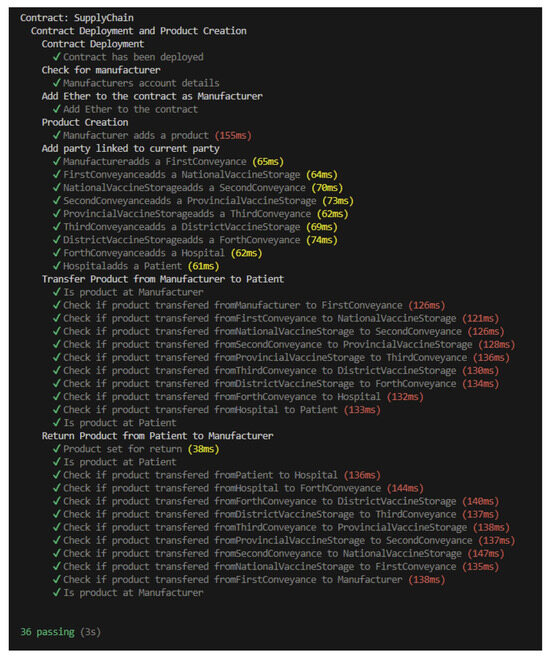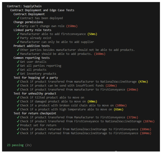 Like flow tests for initializing edge cases, contract deployment is performed before the hook and then later tested to determine whether it was successfully deployed. Then, it checks for whether a party can change its role and permissions or not. After testing the permission feature, another test is performed for duplicate party addition and unlinked party addition. Later, a series of tests are performed to see if only the manufacturer can add a product to the system. Then, a test for the case of trying to skip a party in the chain is performed. Afterward, a test for whether a product can be transferred with insufficient funds is performed. Then, tests are performed to check whether an unhealthy product can move further in the chain. These tests are performed for all possibilities for a product to be unhealthy. Lastly, tests are performed to check if return conditions and functionality are working as intended. These tests include conditions such as trying to move a product set for return and moving a return transfer further after it reaches its return checkpoint.