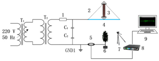 Figure 2). The numbered items in the diagram are as follows: 1. Protective resistor. 2. Insulating rope. 3. Insulator. 4. Simulated conductor. 5. High-frequency current sensor. 6. Tree. 7. Camera. 8. HS5 high-speed data acquisition card. 9. Computer.