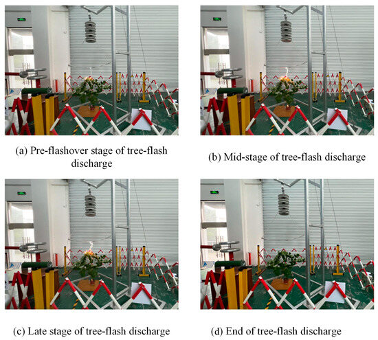 31]. If this safety distance is exceeded, it may lead to tree flash fault discharge problems. Place the required trees directly below the simulated conductors, maintaining a 25 cm gap. Then, gradually increase the voltage using a step-up method until a bright arc occurs at the top of the tree, with the entire process being recorded by a camera. Finally, trigger the protection action of the test transformer, and shut down the tree flash fault discharge test platform. The data acquisition card collects the discharge current waveform, which is stored on the computer, and multiple tests are conducted to record the optimal results.