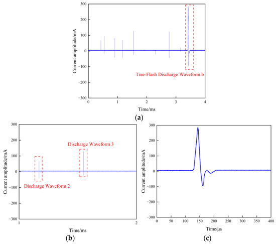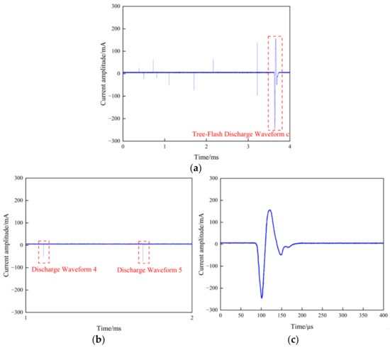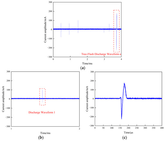 To accurately capture the current waveform of tree flash faults, the HS5 parameters are first set appropriately using a computer. Without any external voltage, we detect noise generated by the device itself or present in the environment, which may introduce interference in the waveform. Through statistical feature analysis of these interference waveforms, we adjust the corresponding parameters to ensure that the device collects data without false triggering. It should be noted that the occurrence of tree flash faults ultimately involves corona discharge. Since the current amplitude of corona discharge is much smaller than that of tree flash discharge, we only need to extract the waveform with the maximum discharge current amplitude from the collected data, which can be identified as the waveform of tree flash fault discharge. This method helps ensure that the collected data is relevant to tree flash faults, thus accurately recording the current waveform of tree flash faults.