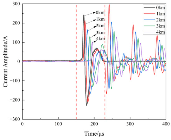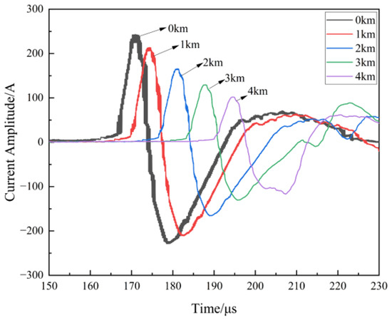 Figure 13, it can be observed that the attenuation of the fault current wave increases with the transmission distance. Consequently, the transition of the fault waveforms becomes smoother, and their amplitudes monotonically decrease with the transmission distance. For instance, at a distance of 1 km from the fault point F, the amplitude is 213.48 A, while at 4 km, it reduces to 101.69 A. Considering the significant attenuation of the tree flash fault current waves, this attenuation may decrease the signal strength, complicating localization. However, the traveling wave method exhibits adaptability to different attenuation environments, relying primarily on time differences in propagation rather than absolute signal strength.