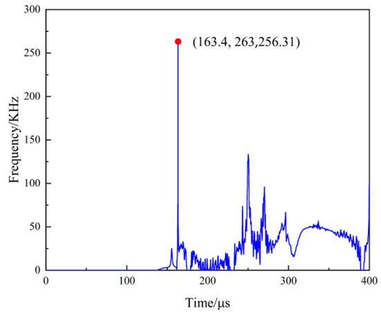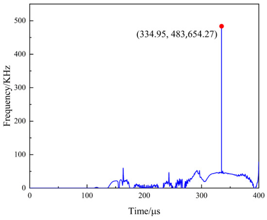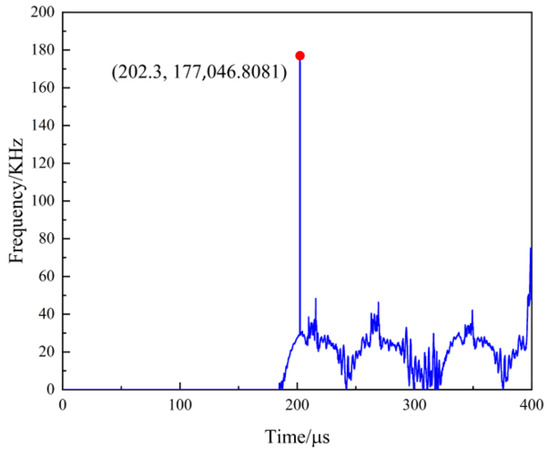 Figure 15, it can be observed that the frequency of the first instantaneous frequency abrupt point of the zero-mode component is 55,653.2 Hz, and the corresponding time is 334.95 μs. Therefore, the time for the zero-mode component of the tree flash fault traveling wave to reach terminal M is 334.95 μs.