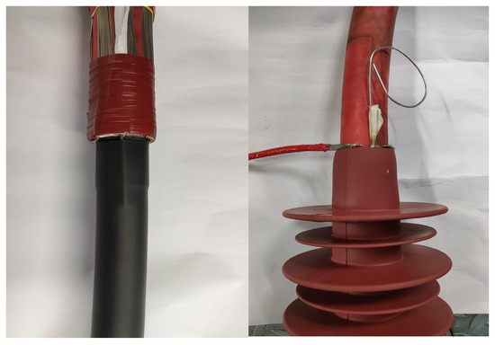The vehicle cable termination undergoes stress due to electrical, magnetic, thermal, mechanical, and flow effects during operation, leading to aging of the insulation material and the formation of gaps between different insulation materials. This can result in partial discharge under high electric field, leading to insulation failure and faults in the cable termination. The termination structure of vehicle-mounted cables mainly consists of cable cores, inner semiconducting layers, main insulation, carbon traces, air gaps, insulation pipes, stress control pipes, insulation glue, and umbrella skirts. In the laboratory environment, to simulate on-site air-gap discharge faults, the manufacturer was commissioned to manufacture cable terminals with air-gap defects. Cable termination is cut at the interface of the stress layer and the main insulation to create a 50 mm long and 2 mm wide gap, and the integrity of the defect was maintained by introducing a steel needle into the gap, which was subsequently removed for testing purposes. The structure of the artificial defect cable termination can be observed in Figure 1, and the physical image is provided in Figure 2.