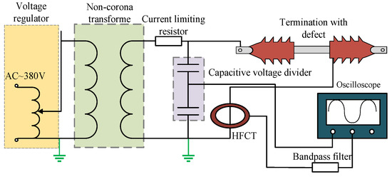 The high-frequency current technique (HFCT) is employed for the detection of the pulse current signal emanating from partial discharge sources. The coil-type sensor is installed on the cable termination grounding wire. The partial discharge testing platform is mainly composed of a power supply, a corona-free transformer, a protective resistor, and a coupling capacitor. Connecting the AC power supply to the isolation transformer can ensure that its power supply has no interference. The input of the voltage regulator is 380 V AC power frequency, and the output is continuously adjustable from 0 to 500 V. The voltage level is improved using a non-partial discharge transformer with a transformation ratio of 1:400 and a capacity of 200 kVA. A 5 kΩ current-limiting resistor is connected in series to the test circuit to prevent large currents from occurring during breakdown. The transformation ratio of the capacitor voltage divider is 1000:1.