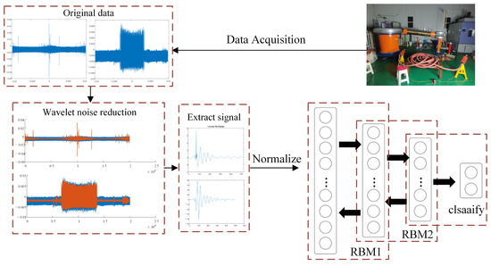 In response to the measured partial discharge and corona discharge, a classification process based on WT-DBN is proposed, as shown in the flowchart in Figure 8, and the prescribed steps are outlined as follows: