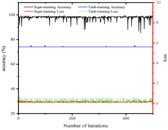 Based on Figure 9, the training precision and loss arc of the WT-DBN sorting method founded on two types of activation functions can be observed during 500 iterations. The WT-DBN classification method founded on the sigmoid activation function exhibits higher classification accuracy and lower loss compared to the tanh activation function; although there is some minor random fluctuation during training, the overall classification accuracy exceeds 90%. As illustrated in Table 1, the average loss value for sigmoid is less than tanh during the training process, the average accuracy for sigmoid is greater than tanh, and the classification accuracy for sigmoid is also greater than tanh. The WT-DBN classification model based on the sigmoid activation function demonstrates better learning performance and training effects, attributed to the sigmoid function’s output ranging from 0 to 1, rendering it appropriate for binary classification problems. While the tanh function’s output range is between −1 and 1, its derivative approaches zero when the input is close to positive or negative limits, potentially resulting in the disappearing of gradient value. Taking the convergence of loss arc and training accuracy into consideration, this research selects sigmoid as the activator for WT-DBN.