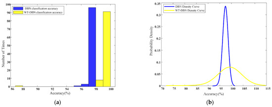 Distribution of classification accuracy based on DBN and WT-DBN: (a) Classification accuracy. (b) Density curve.