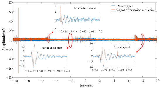 The dependability of WT-DBN is being verified by selecting the WT-DBN model trained using the method outlined in Section 4.3 to identify the raw signals by conducting experiments with mixed signals containing corona discharge and partial discharge lasting up to 20 ms. The comparison of the before and after effects of noise reduction on raw signals is shown in Figure 14, while the identification results of the partial discharge signals disrupted by corona discharge are depicted in Figure 15.