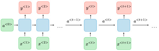 Recurrent neural networks (RNNs) represent a category of ANNs characterized by their dynamic behavior over time, owing to the interconnections between nodes forming either a directed or undirected graph across a time series [44]. These networks stem from feedback neural networks and possess the capability to handle input sequences of varying lengths by utilizing their internal state (memory), making them a kind of dynamic neural network. The basic architecture of the RNNs and the transfer processing are illustrated in Figure 3.
