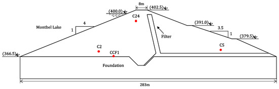 Although the selected monitoring section has 10 sensors, some monitoring data are in poor regularity, with interrupted monitoring or recording errors. Therefore, the most representative four monitoring points (with the completed dataset, marked with red points in Figure 5, including C2 (upstream of the dam body), C5 (downstream of the dam body), CCF1 (foundation of the dam), and C24 (near the filter) are selected for the building prediction model.