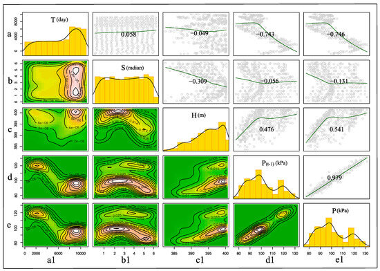 Pearson coefficients (C2) between the target (PWP) and influential factors (The numbers above the diagonal line indicate the correlation coefficients of the parameters corresponding to the horizontal and vertical coordinates, and the curves on the scatter plot indicate the regression curves of the two parameters. The cloud graphs illustrate the density of each pair of related parameters: denser circles indicate more concentrated data points; the height of the yellow histogram and the curve above it represent the density of data of every single factor). The notations a, b, c, d, e denote the corresponding rows of the picture; the notations a1, b1, c1, d1, e1 denote the corresponding columns of the picture, and the combination of the two notations can locate a picture. For example, the notation b1a denotes the contour cloud of the correlation coefficients of the parameters S and P. The symbols a1, b1, c1, d1, e1 denote the corresponding picture rows.