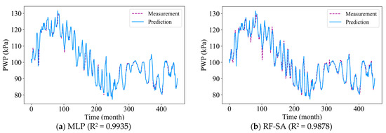 where and represent the measurement and prediction of the PWP, respectively; is the mean of the measurement. The loss function is also defined by MSE. It is important to note that the models exhibiting superior performance are those with higher R2 values and lower MSE values.