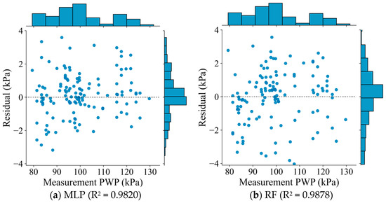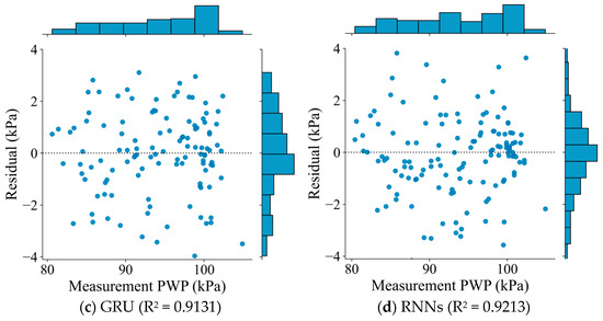 The distribution of the prediction PWP (testing set) and the residual contrast with the following measurements: (a) MLP (R2 = 0.9947); (b) RF (R2 = 0.9878); (c) GRU (R2 = 0.9131); (d) RNNs (R2 = 0.9213). The points represent the residual value, and the histogram on the right and top of the graph denotes the density of data.