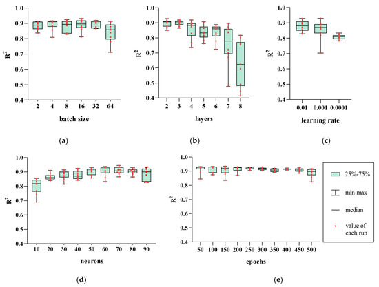 As seen in Figure 10, the loss (MSE) decreases with epoch times increase. However, more epochs do not mean that the model is more accurate, as shown in Figure 9e. The overfitting phenomenon may happen when the epochs are exaggerated in neural networks. Such a phenomenon could occur in the MLP model as well. When it happens, the training epoch needs to be decreased so as to learn less noise and detail of the dataset evolution. It can be noticed that the impact of varying batch sizes and epochs on model performance is not as pronounced as the effects of varying the number of hidden layers, learning rate, and neurons.