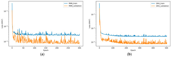 Loss function (defined by MSE) convergence processing in (a) RNNs and (b) GRU.