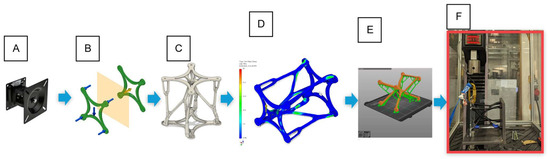 Component re-design and evaluation through GD and AM, evaluated with simulation and mechanical testing. (A) Evaluating design criteria based on original component design. (B) Framing a generative design problem. (C) Selecting the most appropriate GD outcome for AM. (D) Prediction of maximum load-bearing capabilities using simulation. (E) Component manufacturing using AM. (F) Mechanical destructive testing to identify maximum load before failure.
