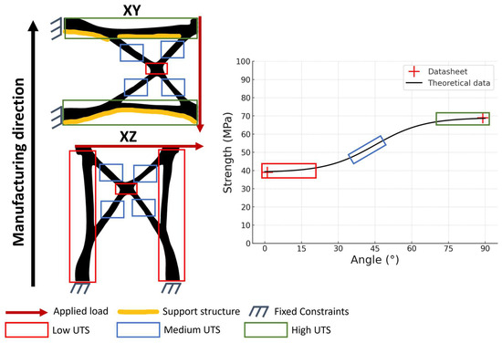 In the XY manufacturing direction, the datasheet reports a UTS of 69 MPa with a Young’s modulus of 3138 MPa. In the XZ and YZ directions, the UTS is reduced to 39 MPa with a Young’s modulus of 3112 MPa. The design groups were all advised to use solid infill, and as suggested by the literature, a 45/−45° raster [29]. The solid infill provides the opportunity for simulations and links to the GD tool, as Fusion 360 (Autodesk Fusion 360 v.16.4.0.2062) provides solid outcomes. Based on previous literature and the mechanical properties of PLA material, it is possible to extract the UTS based on build orientation, as seen in Figure 3 [28]. The orientation can then be used to evaluate the FEM simulation to predict the fracture location and the maximum applied load. The MEX manufacturing direction and method to apply UTS based on orientation using PLA is shown in Figure 3.