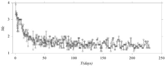Some seismologists think that the aftershocks are so dense immediately after the mainshock that some of them overlap with each other. As a result, not all of the aftershocks can be recorded, which leads to the incompleteness of the aftershock catalog in the initial period after the mainshock, resulting in a large c-value. The c-value for a complete aftershock catalog should be zero [16]. In this study, we obtained a c-value of 2.823 ± 0.288, which is relatively large due to the incomplete aftershock catalog in the initial period after the mainshock (Figure 5). Furthermore, the complexity of the earthquake rupture process can lead to a large c-value [17]. Therefore, the large c-value in this study also suggests the complexity of the fault rupture process of the Wenchuan earthquake to a certain extent.