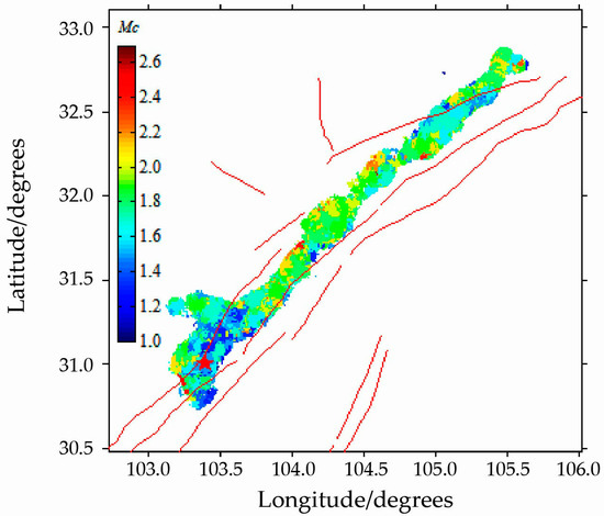 Using the above method, we explored the pattern of spatiotemporal variation in the minimum completeness magnitude. After an earthquake, seismic monitoring in the epicenter area inevitably strengthens, so the minimum completeness magnitude that can be monitored decreases over time. We investigated the temporal variation in the minimum complete magnitude Mc using a moving time window approach [9]. First, we estimated Mc using 200 aftershocks following the mainshock; then, we moved the window forward in time by 100 earthquakes to successively calculate Mc to obtain the pattern of the temporal variation in Mc (Figure 2). In Figure 2, Mc roughly exhibits an exponential decaying trend over time. In the first few hours after the mainshock, Mc fluctuated around a magnitude of 3.5 and then sharply dropped to approximately 2.5. In the following week, the Mc rebounded to a magnitude of approximately 2.8 due to the strong aftershocks during this period. After approximately ten days, Mc stabilized below a magnitude of 2.5. In addition, the value spatially differed due to the uneven distribution of seismic stations in the study area, so we analyzed the spatial distribution of Mc (Figure 3) by dividing the study area into 0.01° × 0.01° grids and counting the number of earthquakes within 5 km around each grid point to calculate the Mc value. Figure 3 demonstrates that the Mc value spatially varied between magnitudes of 1.1 and 2.6, indicating that the aftershock records of magnitudes above 2.6 in the study area are basically complete. Therefore, by combining the temporal and spatial distribution patterns of Mc, we think that the aftershock records of magnitude above 2.7 are basically complete and can serve as a basis for a subsequent study and analysis.