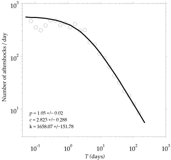 The decay of the Wenchuan aftershock activity over time is shown in Figure 5. Based on the modified Omori model [2,3], three parameters, p, c, and k, were obtained using the maximum likelihood estimation method, with Mmin = Mc = 2.7 and Tstart = 0.05. The calculated p-value was 1.05 0.02, and the c-value was 2.823 ± 0.288. The decay pattern of the Wenchuan aftershocks conforms well to the Omori law (Figure 5), and compared with the value obtained in other studies, the p-value is normal, indicating that the background seismic activity had a minor influence on the decay of the Wenchuan aftershocks. The reason for this finding is that the magnitude and fault rupture area of the Wenchuan mainshock were both large. The seismic activities around the Wenchuan earthquake area were influenced by the ruptured fault of the mainshock over a long period.