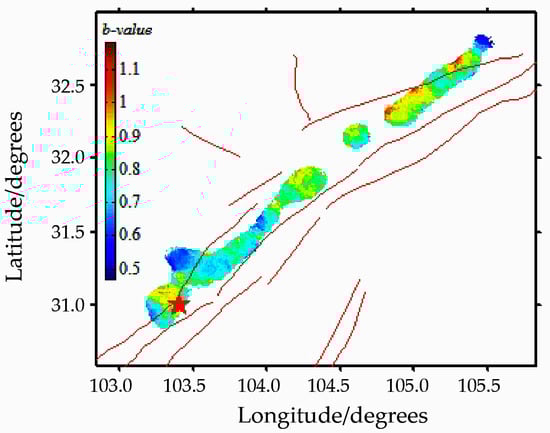 Parsons et al. [27] calculated the changes in the stress in the earthquake area after the Wenchuan mainshock, finding that the stress increased at the intersection of the Longmenshan fault and the Sichuan Basin. Coulomb stress substantially increased in the south of the mainshock fault, and the stress in the Qingchuan and Huya areas decreased. This pattern shows a correlation with the spatial distribution of the b-value that we calculated. As described in Section 3, the b-value was generally small in the earthquake area along the Longmenshan front fault (i.e., the area intersecting the Sichuan Basin) and the southwestern part of the aftershock area, and the b-value was the largest in the Qingchuan area, indicating that areas with large and small b-values may correspond to the regions experiencing small and large stresses, respectively. However, no information is available on the decreases or increases in stress in the areas around the mainshock epicenter, where the b-value was large, and at the northeast end of the aftershock area, where the b-value was the smallest. Based on the above results, we speculate that the stress decreased and increased in these areas, respectively. Moreover, these two areas are located near the starting and end points of the mainshock rupture, so we speculate that subsurface anomalies may exist in these two areas.