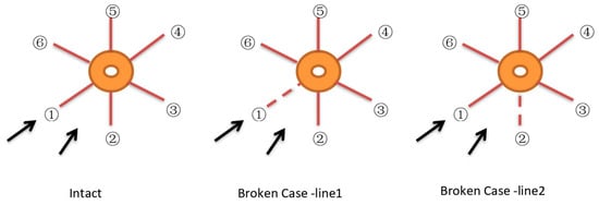 In each condition, the environmental loads need to be divided into several groups. Despite the actual complex conditions, a simplified method is adopted to deal with the environmental loads. For normal environmental conditions, wind, current, and wave in collinear and non-collinear directions are considered. “Collinear” refers to the situation where wind, current, and wave are in the same direction, whereas “non-collinear” implies that wind and current have a 30 and 45 degree deviation from the wave, respectively. The direction of the resultant load can either be aligned with one of the anchor legs or between two legs. According to DNV and ABS regulations [,], one mooring line failure situation is analyzed for each governing case in addition to the intact analysis with no mooring line failure. The mooring line numbering scheme is defined in Figure 2. As a result of the symmetrical configuration, mooring line 1 or 2 is assumed to be the failure line. There are, therefore, 10 cases to be assessed if different failing mooring lines and load directions are considered, as shown in Figure 2. Since two operation conditions (full loading and ballast loading) and the self condition need to be investigated, 30 cases need to be simulated for a design assessment. The other design parameters, namely CALM buoy and VLCC (Very Large Crude Carrier), are fixed to simplify the problem.