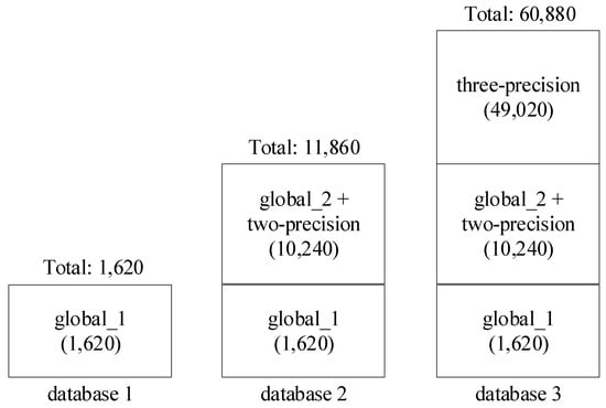 More refined structures for global data and local data are shown in Figure 4 and Figure 5. Because operation calculation is more complicated and time-consuming, the size of the operation condition dataset is made smaller than the self condition dataset to achieve a similar level of computation time. Three datasets are sampled in the operation condition, as illustrated in Figure 4. Dataset 1 (global_1) includes 81 data in the global area sampled by Latin hypercube, which makes the total number of cases 1620, considering 20 working conditions for each sampled global data. Dataset 2 adds 337 global data and two-precision sampled local data to dataset 1. The total amount of added data is 10,240, composed of 6740 (337  20) global data and 5120 local data, which are the combination of the two-precision data of eight input parameters (28) and working conditions (28  20). Dataset 3 adds 131,220 (38  20) three-precision method sampled data to the dataset. However, the model was later shown to achieve satisfactory performance with fewer data, so 49,020 data were used.