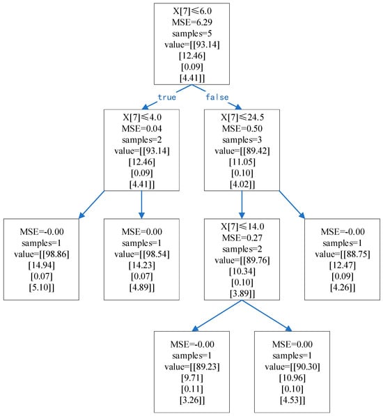 The decision tree continuously divides the dataset through judgment conditions and finally obtains the classification or regression model of the tree []. This research employs a regression decision tree. To facilitate understanding, the regression decision tree generated by the first five self condition training data is presented as an example in Figure 7.