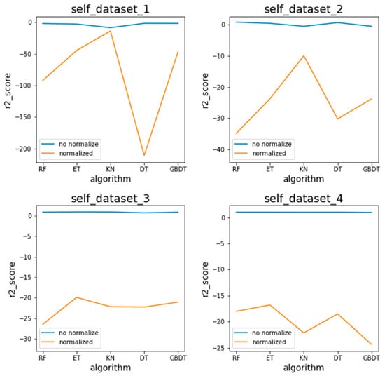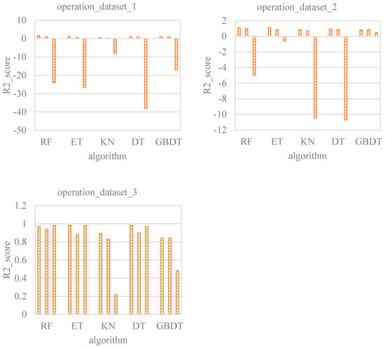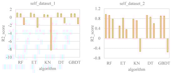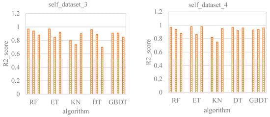 Figure 10 shows the comparison of different models under the self condition. Datasets 1 and 2 are sampled on the global scale, while datasets 3 and 4 add local data based on global data. Because the amount of data in dataset 1 is small, and the sampling points in the global scope are relatively sparse, the r2_score of the test dataset is all negative. Adding global data to dataset 1, the r2_score of the test datasets of RF, ET, and DT become positive (0.7706, 0.3787, and 0.6148). Although the r2_score of KN and GBDT are improved by the addition of global data, the value is still negative. After dataset 3 and dataset 4 add training data near the test points, the accuracy of all the assessed models is greatly improved. However, the histogram of data 4 indicates that the KN and GBDT models still underperform the other three models based on the r2_score.