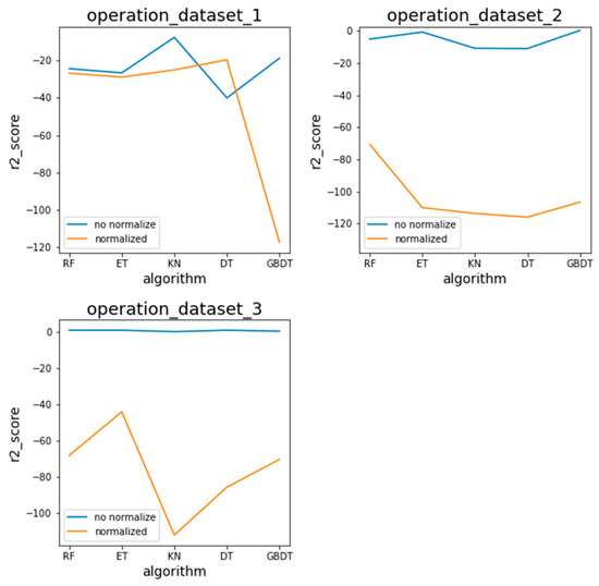 Figure 8 and Figure 9 present the comparison of the prediction accuracy of different models trained by the test datasets with normalized and unnormalized input parameters for the self and operation conditions, respectively. Although the mooring method, dataset, and training models are different, the blue line (unnormalized data) is generally above the orange line (normalized data), which suggests the normalization to be counterproductive. As the amount of data increases, the contrast between the unnormalized and normalized results becomes more obvious. Since the prediction accuracy of the models with unnormalized input parameters is higher than the normalized ones, subsequent experiments do not perform normalization operations.
