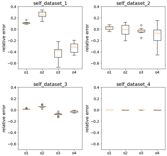 This section further evaluates the performance of the RF model by the relative error as defined by Equation (4). Figure 12 reflects the process in more detail from the perspective of relative error using box plots under the self condition. The closer the relative error is to 0, the closer the predicted value of the model is to the true value. The horizontal axis is the output data o1, o2, o3, and o4, which represent minlaidl, maxchainFC, maxchainFC_DNV, and maxoffsetC, respectively. The vertical axis is the relative error of the RF model calculated by each output data. The value and distribution of the relative error can be observed from the box plots. For the model trained by dataset 1, the relative error of the output data except o1 is far from 0. With the addition of a batch of global data, the relative error of the output data under dataset 2 becomes much smaller with the relative error of o1~o3 bounded by 0.2 and o4 by 0.5, and the box plot is symmetrically distributed around 0. For the model generated by dataset 3 with more local data around the test points, the absolute value of the relative errors of o1, o2, o3, and o4 is under 0.0366, 0.0985, 0.1215, and 0.0546, respectively. The relative errors of the four output data are closer to zero. Sampling more data around the test points, the absolute value of the relative error of the model trained by dataset 4 is almost 0, suggesting little deviation of the predicted output value from the true value.