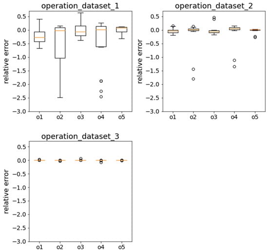 Figure 13 shows the visualized relative error in a box plot for the operation condition. The horizontal axis includes one more output data from that of the self condition. o1, o2, o3, o4 and o5, respectively, represent minlaidl, max_hawserC, maxchainFC, maxchainFC_DNV, and maxoffsetC. For dataset 1 with a small amount of data and sparse distribution, the absolute value of the relative errors of o1, o3, and o5 are overall within the range of 0.5, and the relative errors of o2 and o4 are far from 0, with the values relatively scattered. The absolute value of the relative errors of the five output data on dataset 2 is mostly under 0.3. With further densification of the local data, the absolute value of the relative errors of the five output data of the model trained by dataset 3 is reduced to around 0.
