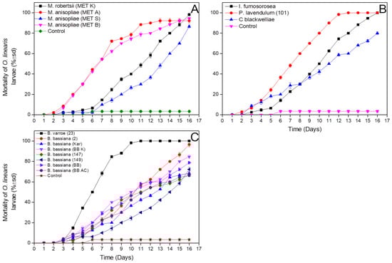 Larval mortality of O. linearis during the present study: (A) Metarhizium strains, (B) other species, and (C) Beauveria strains.