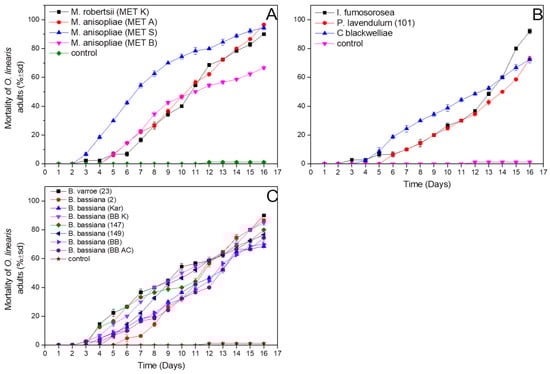 Adult mortality of O. linearis during the present study: (A) Metarhizium strains, (B) other species, and (C) Beauveria strains.