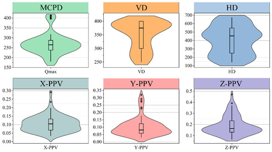 Via violin plots of MCPD, VD, HD, X-PPV, Y-PPV, and Z-PPV.