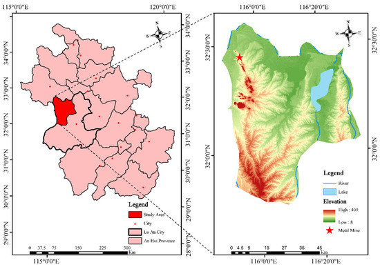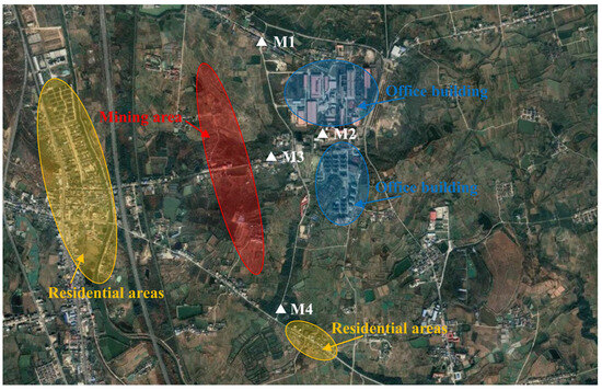 The mine, a large metamorphic iron ore deposit in Anhui, China, stretches over 4 km with a maximum depth of −862 m, the geography of which is shown in Figure 2. The majority of the ore deposit area is covered by Quaternary deposits. The main rock types include granite, gneiss, iron ore, and diabase. Among them, the gneiss rock mass has a good quality, while the ore body, granite, and diabase rock masses range from moderate to good quality. The rocks in the mining area are mainly characterized by stratified and disseminated structures, with blocky structures being secondary. The overall stability of the ore rocks is good. The mine uses a mining method of subsequent backfilling of the stage empty field and fan-shaped medium-deep hole drilling and blasting. A large number of residential areas and offices are distributed around the mining area, and blasting vibrations can affect the safety of buildings.