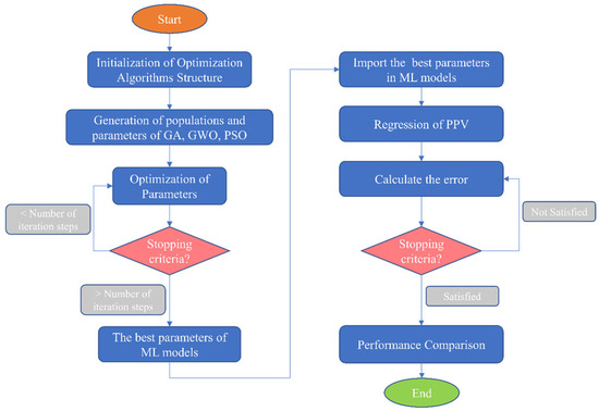 In ML models, parameters are adjustable variables that directly affect a model’s performance and prediction ability. By adjusting parameters, a model can better fit data and predict unknown data. However, there are many combinations of parameters in ML models due to the large number of parameters and the wide range of values for each parameter. Therefore, for ML model parameter tuning, GA, GWO, and PSO AI optimization algorithms were used to find the optimal parameters to predict PPV. This method has the advantages of efficiency and optimality compared to traditional parameter tuning methods. The proposed method is shown in Figure 4. In this study, the construction and estimation of the ML models were achieved using the scikit-learn library in the Python 3.10 environment.