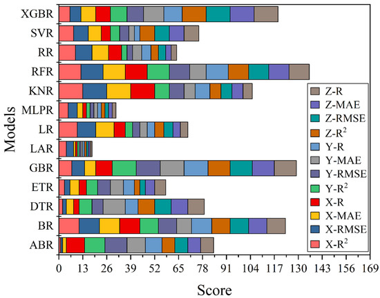 As in previous studies [44,45,46], 13 ML regression models have been used to predict the X-PPV, Y-PPV, and Z-PPV in underground metal mines. To eliminate dimensional effects and balance the weights of input features, all data were preprocessed through a normalization method before model training [47]. According to the previous studies [23,48], the larger the values of R and R2 in the evaluation indicators, the better the performance of the model; additionally, the smaller the MAE and RMSE values, the higher the performance of the model. Therefore, to obtain the best models of prediction for the X-PPV, Y-PPV, and Z-PPV, the R2, R, RMSE, and MAE of each model were sorted, with the best one achieving nine points. Finally, the total rank scores of each model were sorted. The results are shown in Figure 5. The top three models, RFR, BR, and GBR, scored 136, 123, and 129, respectively. This indicates that the regression performance of these three models is better; therefore, they were selected to be the prediction ML models. As shown in Figure 6, these prediction models have poor predictive performance for the X-PPV, Y-PPV, and Z-PPV, and they require parameter tuning.