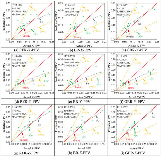 As illustrated in Figure 11, the errors of the X-PPV and Y-PPV were mainly distributed between (−0.04, 0.06), while the errors of Z-PPV were mainly distributed between (−0.04, 0.04), indicating that Z-PPV had higher prediction accuracy. In addition, based on the mean and standard deviation of prediction errors for the X-PPV, Y-PPV, and Z-PPV, it was found that GWO-GBR had the smallest prediction error. This illustrates that GWO-GBR had the best prediction performance in regard to the X-PPV, Y-PPV, and Z-PPV. As illustrated in Figure 12, among the selected models, the GWO-GBR model was the best in predicting the X-PPV, Y-PPV and Z-PPV. Based on the above evaluation results, it can be obtained that the GWO-GBR had a better learning and prediction capability in predicting the X-PPV, Y-PPV and Z-PPV.