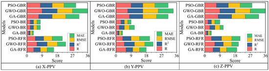 As shown in Figure 7, the rank score of GWO-GBR for the X-PPV, Y-PPV, and Z-PPV were 36, 34, and 36, respectively. The rank score of GA-GBR for the X-PPV, Y-PPV, and Z-PPV were 31, 31, and 32, respectively. The rank score of PSO-GBR for the X-PPV, Y-PPV, and Z-PPV were 29, 31, and 28, respectively. Thus, GWO-GBR, GA-GBR, and PSO-GBR were the first three models used to predict the performance of the X-PPV, Y-PPV, and Z-PPV.