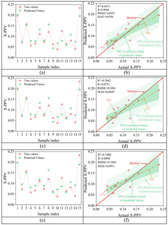 The prediction performance of X-PPV: (a) the measured and predicted results of GWO-GBR; (b) the confidence band and prediction band of GWO-GBR; (c) the measured and predicted results of GA-GBR; (d) the confidence band and prediction band of GA-GBR; (e) the measured and predicted results of PSO-GBR; (f) the confidence band and prediction band of PSO-GBR.