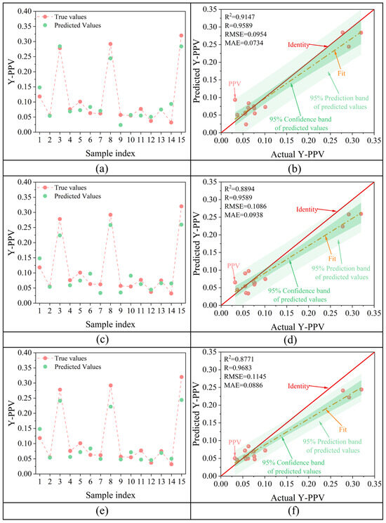 The prediction performance of the Y-PPV: (a) the measured and predicted results of GWO-GBR; (b) the confidence band and prediction band of GWO-GBR; (c) the measured and predicted results of GA-GBR; (d) the confidence band and prediction band of GA-GBR; (e) the measured and predicted results of PSO-GBR; (f) the confidence band and prediction band of PSO-GBR.