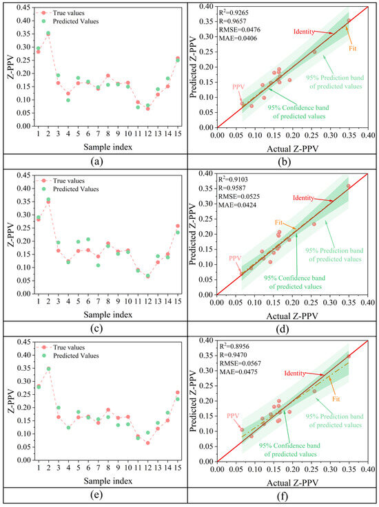The prediction performance of Z-PPV: (a) the measured and predicted results of GWO-GBR; (b) the confidence band and prediction band of GWO-GBR; (c) the measured and predicted results of GA-GBR; (d) the confidence band and prediction band of GA-GBR; (e) the measured and predicted results of PSO-GBR; (f) the confidence band and prediction band of PSO-GBR.