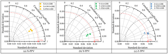 The Taylor diagram for performance from each model: (a) for X-PPV; (b) for Y-PPV; (c) for Z-PPV.