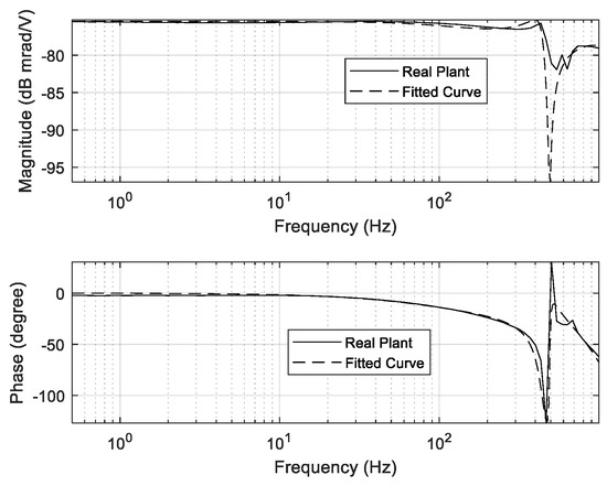 In the conventional approach to designing a High-precision FSM control system for tip-tilt control, a PZT actuator is used. The frequency response function (FRF) of an actuating plant is typically obtained using the sine-sweep method. Meanwhile, the real plant considered herein consists of a PZT actuator, a DC-DC converter-type amplifier, and a sensor amplifier. The dynamic specifications of the real plant indicate that its resonance frequency is 450.2 Hz. The DC sensitivity, voltage amplifier gain, and sensor amplifier gain are 168.3 µrad/V, 10 V/V, and 0.0059 V/µrad, respectively. Therefore, the real plant can be modeled as the following fifth-order transfer function [33]: